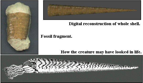 Orthocones show a similar morphology to the modern Pearly Nautilus except that the shell is straight. This is a piece of Orthoceras bulatum.