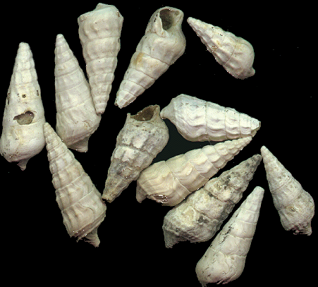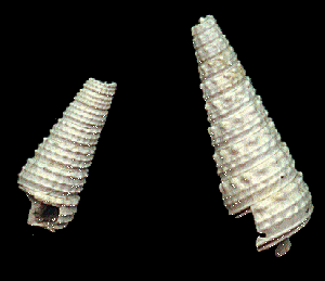 The two specimens in this image are much less common. The shell on the left is Potamides vagus and the one on the right is Tympanotonos funatus.