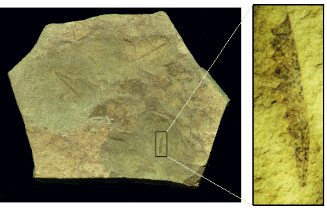 The specimen above contains many examples of Monograptus colonus. The magnification shows more detail: The jagged edge formed a series of cups each with its own zooid.