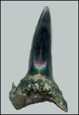 This tooth belonged to a sand shark called Eugomphodus which lived about 40 million years ago. Although they are not common, they can sometimes be found in the clay layers in Whitecliff Bay on the east side of the island.
