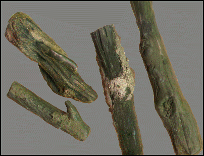 These are several fragments of wood from the beach to the east of Sheerness. They are preserved in pyrites and show a remarkable degree of detail. The grain of the wood and the connections for small branches are clearly visible.
